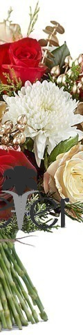 6 x Red Roses, 4 x Champagne Roses, 2 x White Chrysanthemums, Seasonal leaves and foliage