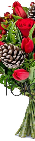 5 Red Roses, 7 Red Tulips, Red Hypericum Berries, Pinecones